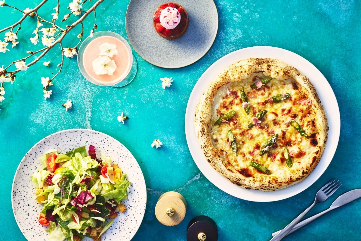 ナポリ出身のエグゼクティブシェフが腕を振るうピザは、桜の花びらを散りばめ、春が旬のアスパラガスとチーズを組み合わせた「チーズ アスパラガス 桜のホワイトピザ」。春らしい彩りと香りが食欲をそそります。