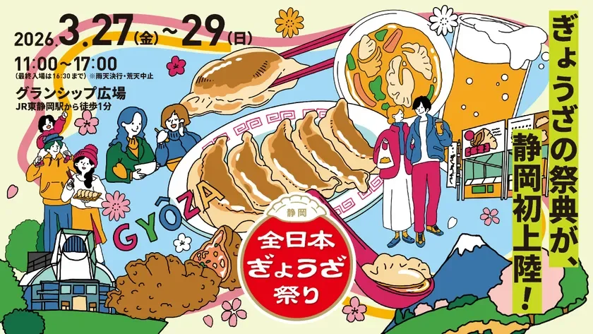日本最大級の餃子イベント「全日本ぎょうざ祭り」が、2026年3月27日から29日の3日間、静岡市のグランシップ広場に初上陸します!全国各地の名物餃子が大集結し、肉汁あふれる熱々の一皿とビールで最高のひとときを過ごせますよ。 -