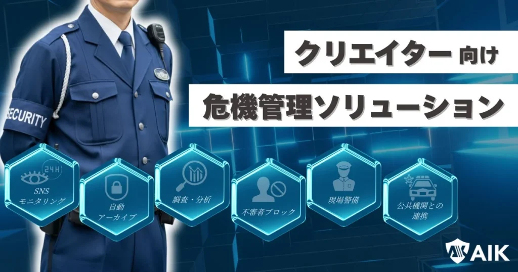 株式会社AIKが、YouTuberやインフルエンサーの皆さんが抱える「Web上での誹謗中傷」や「リアルでの不審者問題」といった悩みを解決する「クリエイター危機管理ソリューション」の提供を開始しました。SNS監視から現場警備まで、あなたの活動をしっかりサポートし、安心して輝ける環境を届けます。 -